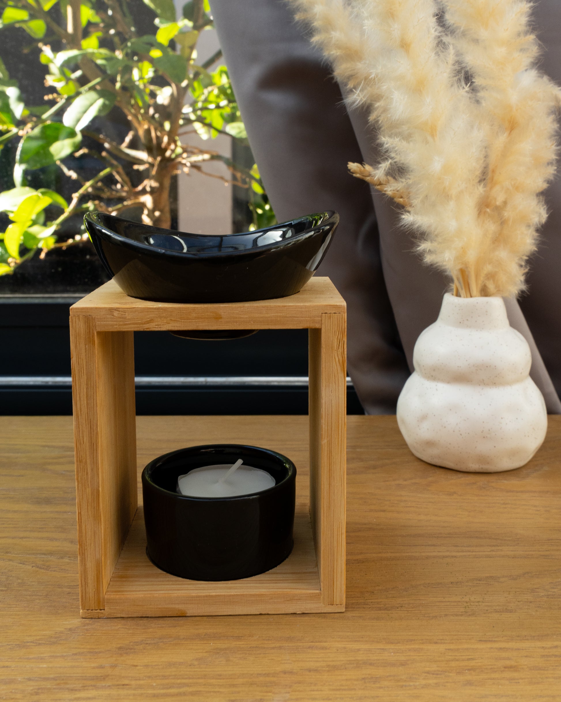 🕯️ Un brûle-parfum élégant et pratique, en céramique avec un socle en bambou, pour diffuser tes fondants préférés en toute sécurité. Compact et décoratif, il apporte chaleur et parfum à ton intérieur.