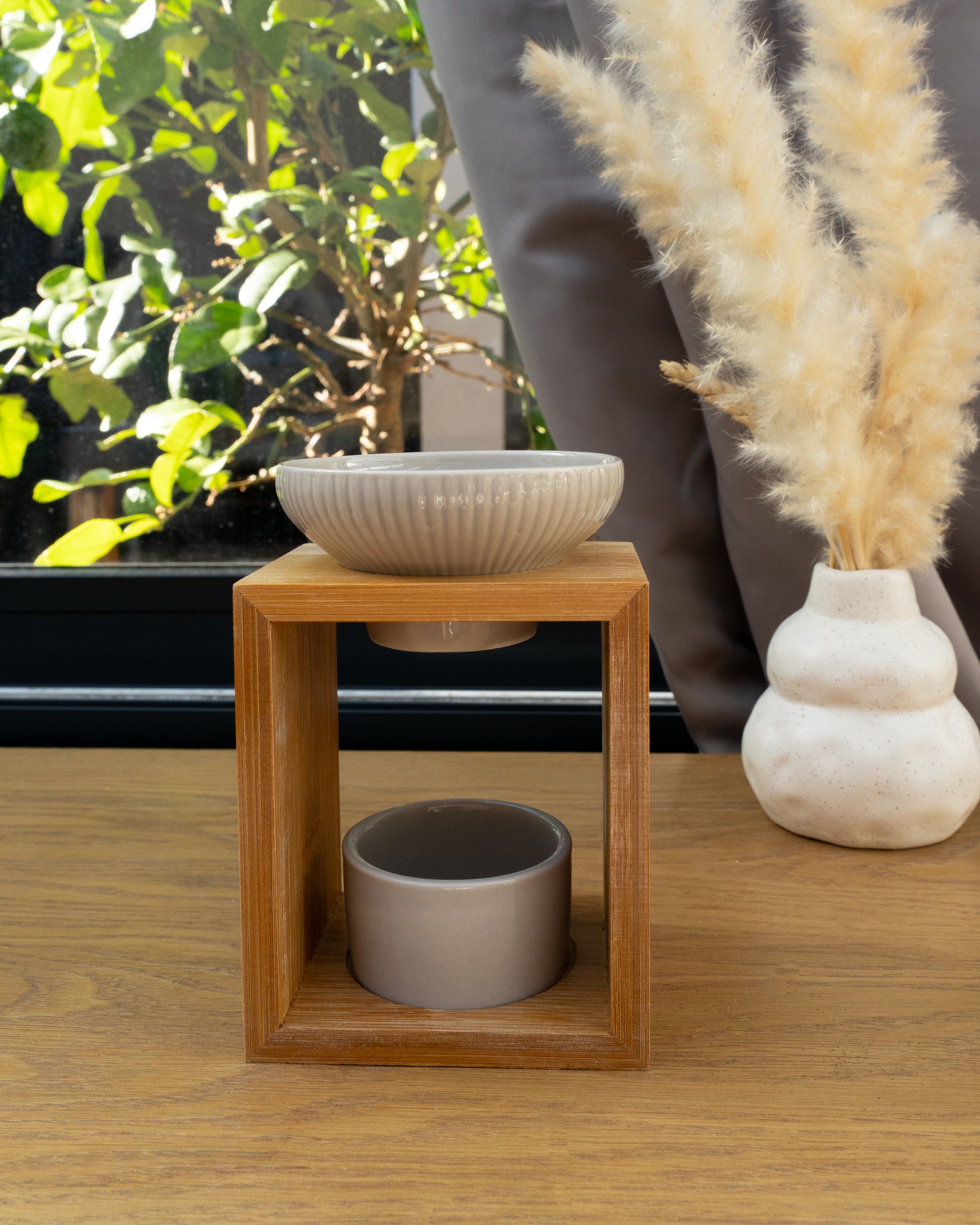 🕯️ Un brûle-parfum élégant et pratique, en céramique laquée avec un socle en bambou, au design authentique et artisanal. Ses éléments en céramique sont amovibles pour une utilisation facile, et il diffuse tes fondants préférés en toute sécurité tout en décorant ton intérieur.