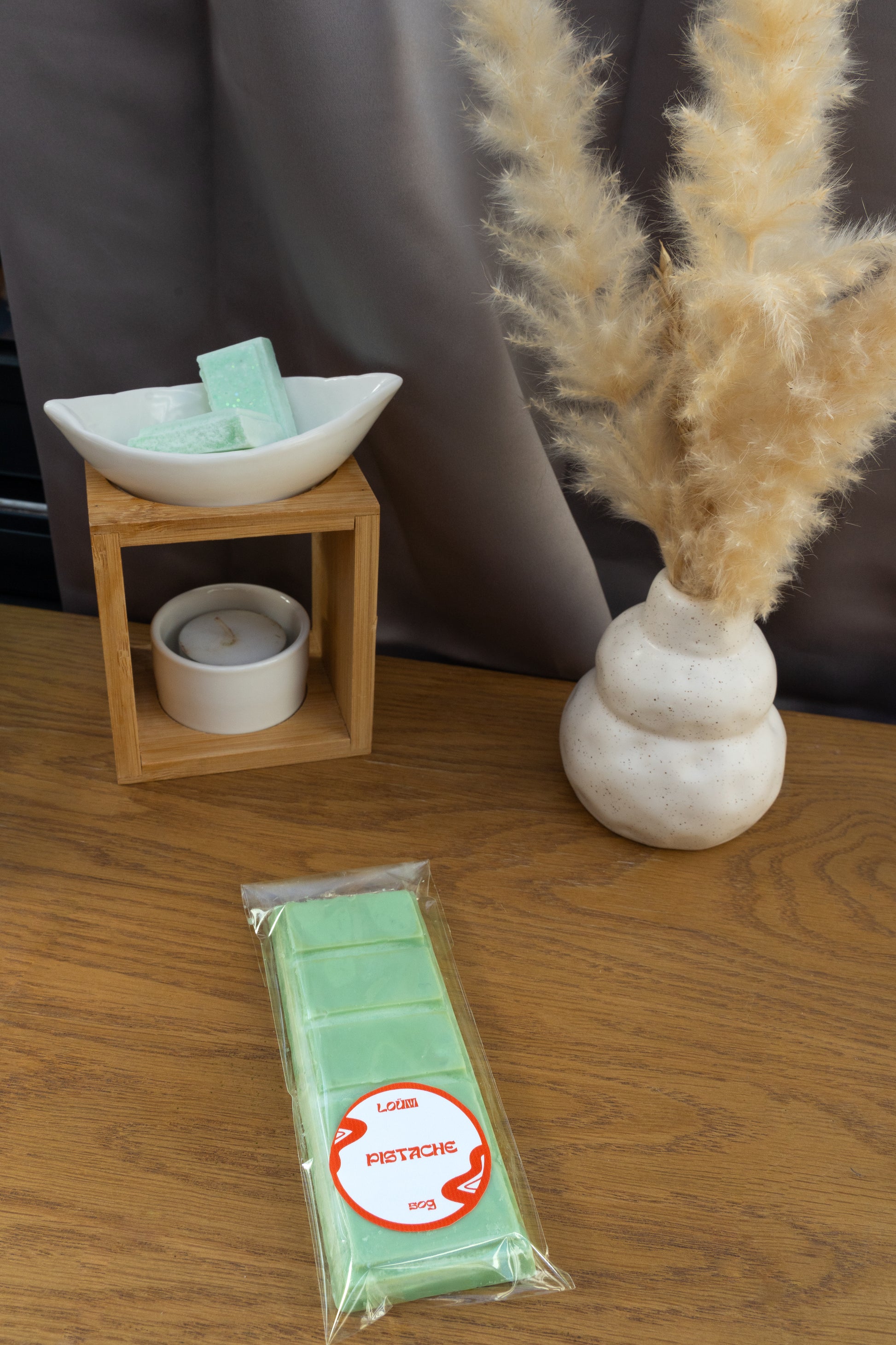 Un mélange subtil de notes vanillées, fruitées et gourmandes, enrichi de pistache et de cacao pour une ambiance chaleureuse et réconfortante.
